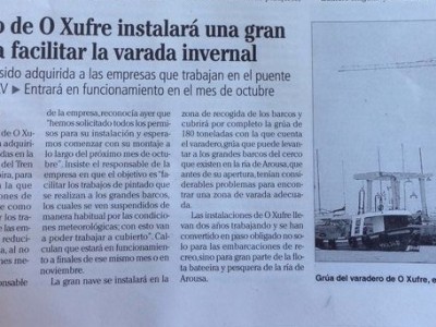 Nuestra nave ya es noticia. El Faro de Vigo daba cuenta el domingo pasado de la inminente construcción de la nave, que posibilitará varadas programadas al margen de las inclemencias del tiempo. Más info